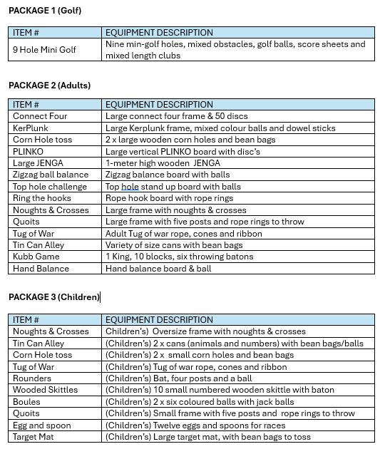 The Wright Games are normally hired out in three distinct packages, Golf, Adult and Children.